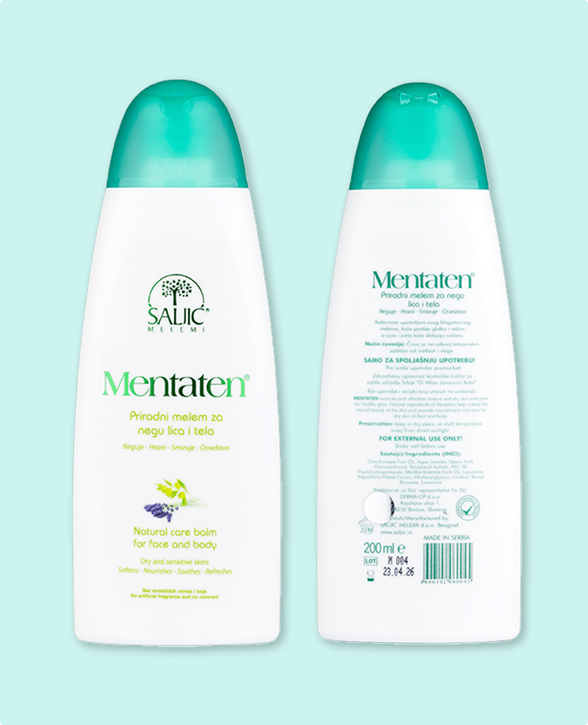 Mentaten je prirodni melem namenjen nezi kože lica i tela. Namenjen je za negu suve,dehidrirane i osetljive kože.